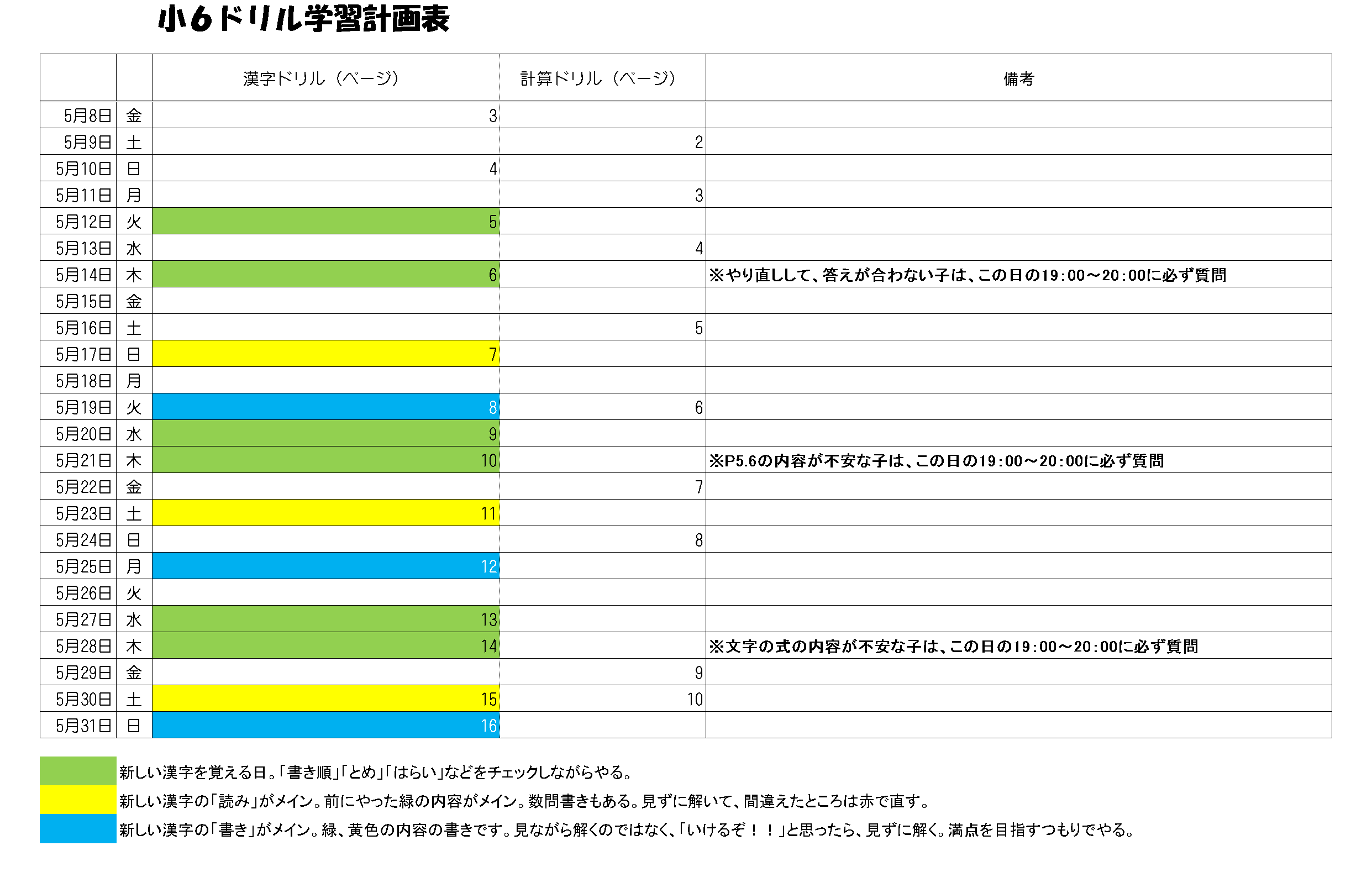 小6の学習計画です。