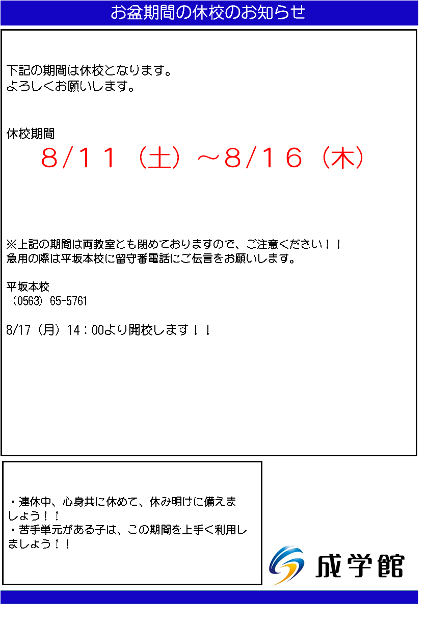 お盆休暇が11日~なので、これを良い刺激、復習のきっかけにしてもらえたらと思います。